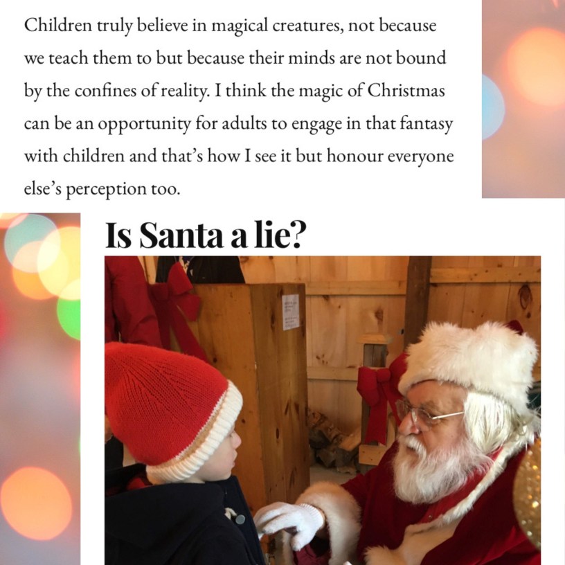 Children truly believe in magical creatures, not because we teach them to but because their minds are not bound by the confines of reality. I think the magic of Christmas can be an opportunity for adults to engage in that fantasy with children and that’s how I see it but honour everyone else’s perception too.